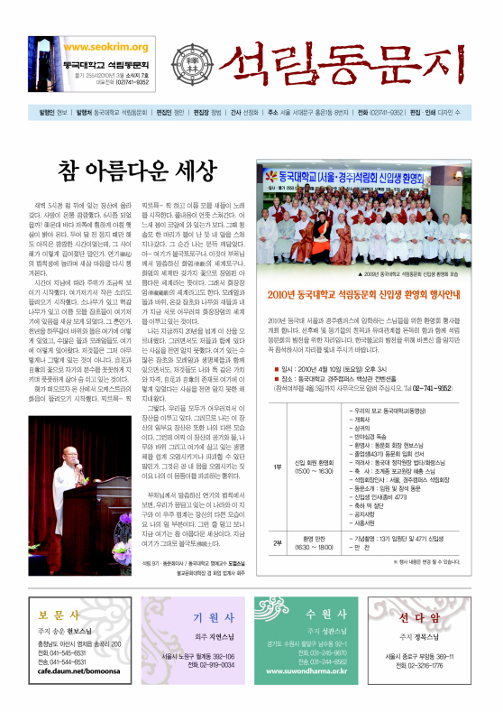 1¸é¿¡ µ¿¹®È¸ÀÌ»çÀÌ½Ã¸é¼ µ¿±¹´ë ¸í¿¹±³¼öÀ̽еµ¾÷Å«½º´ÔÀÇ ±Û°ú 2010³â µ¿±¹´ë ¼®¸²µ¿¹®È¸ ½ÅÀÔ»ý ȯ¿µÈ¸ Çà»ç ¾È³»¸¦ ´ã¾Ò½À´Ï´Ù. ±×¸®°í µ¿¹® ½º´ÔµéÀÇ È°¾à»ó, ¼¿ï °æÁÖ ÀçÇлý ½º´ÔµéÀÇ ¼Ò½Äµµ ´ã¾Ò½À´Ï´Ù. ÁÖ¼Ò ÆÄ¾ÇÀÌ Àß ¾ÈµÇ¾î ÀÖ´Â °ü°è·Î ¼¿ïµ¿¹®Àº 477Åë, °æÁÖµ¿¹®Àº 136ÅëÀ» ¹ß¼ÛÇÏ¿´½À´Ï´Ù. Ȥ ¹Þ¾Æº¸°í ½ÍÀ¸½Ã¸é ¿¬¶ô ÁÖ½Ê½Ã¿ä ¹Ù·Î º¸³»µå¸®°Ú½À´Ï´Ù. °¨»çÇÕ´Ï´Ù.