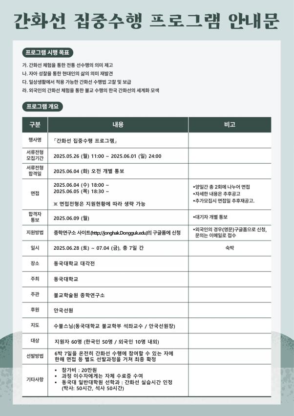»çÀü ¼±¹ßÀ» ÅëÇØ ¼±Á¤µÈ Âü°¡ÀÚµéÀ» ´ë»óÀ¸·Î ¹ý¹®, ÁýÁß¼öÇà, ¸é´ã µîÀÇ °úÁ¤ÀÌ ÁøÇàµÈ´Ù. 7Àϰ£ Àü °úÁ¤À» ¼º½ÇÈ÷ À̼öÇÑ Âü°¡ÀÚ¿¡°Ô´Â ¼ö·áÁõÀÌ ¼ö¿©µÈ´Ù. Á¾Çבּ¸¼Ò ÃøÀº ¡°À̹ø °£È¼± ÁýÁß¼öÇà ÇÁ·Î±×·¥Àº Çѱ¹ ÀüÅë ºÒ±³ ¼öÇà¹ýÀÎ °£È¼±ÀÇ °¡Ä¡¸¦ ³Î¸® ¾Ë¸®°í, Âü°¡Àڵ鿡°Ô Çѱ¹ Á¤½Å¹®È¸¦ Á÷Á¢°æÇèÇÏ´Â ¶æ±íÀº ±âȸ°¡ µÉ °Í¡±À̶ó¸ç ¡°°£È¼±ÀÇ ÇÙ½É °³³ä°ú ¼öÇà ÀÌ·ÐÀ» ±â¹ÝÀ¸·Î ÇÑ ¹ý¹®À» ÅëÇØ Âü°¡ÀÚµéÀÌ ±íÀÌ ÀÖ´Â ÅëÂû°ú »îÀÇ Àǹ̸¦ »õ±â´Â °è±â°¡ µÉ °Í¡±À̶ó°í ±â´ëÇß´Ù.