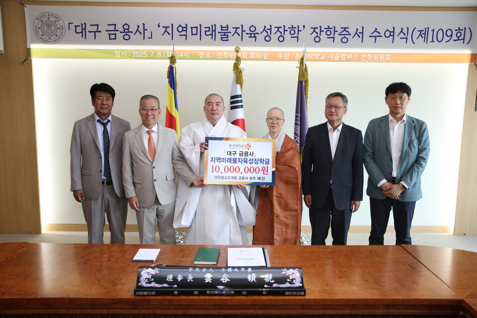 Çб³¹ýÀÎ µ¿±¹´ëÇб³(ÀÌ»çÀå µ·°ü½º´Ô)´Â 7¿ù8ÀÏ ¼¿ïÄ·ÆÛ½º¿¡¼ ¡®´ë±¸ ±Ý¿ë»ç Áö¿ª¹Ì·¡ºÒÀÚÀ°¼ºÀåÇÐ ÀåÇÐÁõ¼ ¼ö¿©½Ä(Á¦109ȸ)¡¯À» °³ÃÖÇß´Ù.