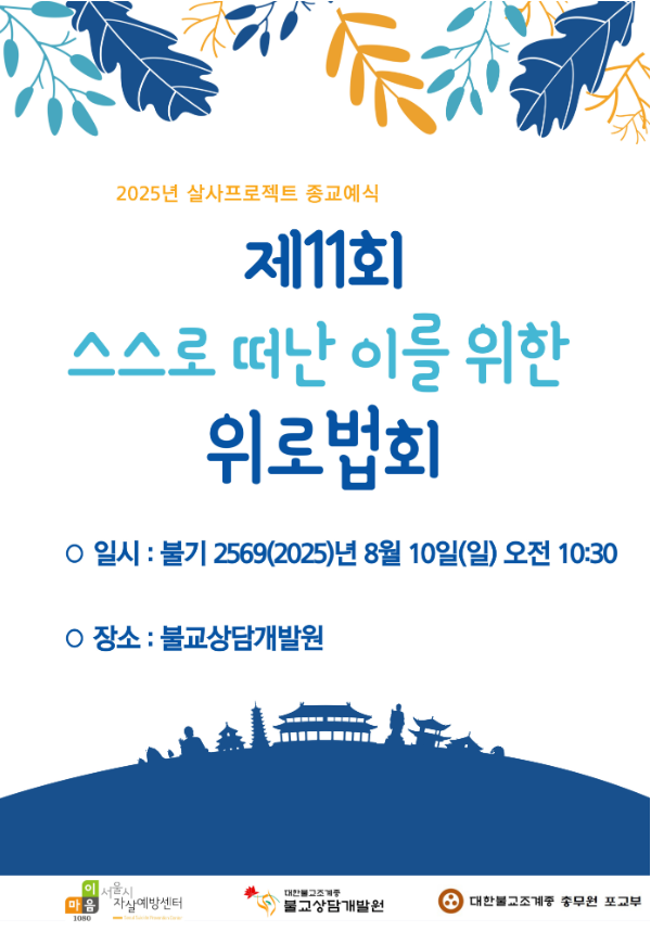 Á¶°èÁ¾ ºÒ±³»ó´ã°³¹ß¿ø(¿øÀå Á¾ºÀ½º´Ô)ÀÌ 8¿ù10ÀÏ ¿ÀÀü10½Ã30ºÐ ¼¿ï °³¿î»ç¿¡¼ ¡®Á¦11ȸ ½º½º·Î¸¦ ¶°³ À̸¦ À§ÇÑ À§·Î ¹ýȸ¡¯¸¦ °³ÃÖÇÑ´Ù. ÀÚ»ìÀ» ½ÃµµÇÑ Àû Àְųª, ÁÖº¯ÀÎÀÇ ÀÚ»ì·Î ±íÀº »ó½ÇÀ» °æÇèÇ߰ųª »îÀÇ ÀÇÁö¸¦ ³õ¾Æ¹ö¸± ¸¸Å Å« ¾ÆÇÄÀ» °Þ°í ÀÖ´Â »ç¶÷µéÀ» À§ÇÑ ÀÚ¸®´Ù.