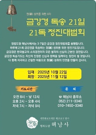 ¿ï»ê ÇØ³²»ç(ÁÖÁö Çý¿ø ½º´Ô)´Â ¿À´Â 10¿ù 22ÀÏ ¿ÀÀü 10½Ã ÀÔÀç½ÄÀ» ½ÃÀÛÀ¸·Î 11¿ù 12ÀϱîÁö 21ÀÏ µ¿¾È ¡®¿ø(êÃ) ¼ºÃ븦 À§ÇÑ Á¦8Â÷ ±Ý°­°æ µ¶¼Û 21ÀÏ 21µ¶ Á¤Áø´ë¹ýȸ¡¯¸¦ ºÀÇàÇÑ´Ù.