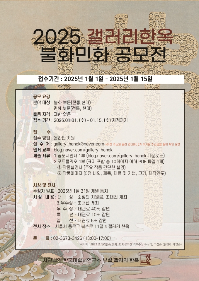 °ø¸ðÀüÀº ´©±¸³ª Âü¿©°¡´ÉÇÏ¸ç ³»¿ë ¶ÇÇÑ Á¦ÇÑÀÌ ¾ø´Ù. °ø¸ðÀü Âü¿© Èñ¸ÁÀÚ´Â °¶·¯¸®ÇÑ¿Á ºí·Î±×(blog.naver.com/gallery_hanok)¿¡¼­ °ø¸ðÁö¿ø¼­¸¦ ³»·Á¹Þ¾Æ ÀÛ¼ºÇÑ µÚ Æ÷Æ®Æú¸®¿À 1ºÎ, ÀÚ±â¼Ò°³¼­, ÀÛǰ°³¿ä¼­, ÀÛǰ À̹ÌÁö µîÀ» ÷ºÎÇØ 2025³â 1¿ù1ÀϺÎÅÍ 15ÀϱîÁö À̸ÞÀÏ(gallery_hanok@naver.com)·Î Á¢¼öÇÏ¸é µÈ´Ù.
