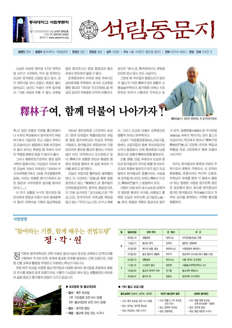 Áö³ 3¿ù¿¡ ÁغñÈ£°¡ ¹ßÇàµÈ ÀÌÈÄ 2¹øÂ° ¼®¸²µ¿¹®Áö°¡ ¸¹Àº ³»¿ëÀ» ´ã°í ž½À´Ï´Ù. µ¿±¹´ë Á¤°¢¿øÀå ¹ýŸ½º´ÔÀÇ ±Û°ú ÇÔ²² Á¤°¢¿ø ¼Ò°³¸¦ ´ã¾Ò½À´Ï´Ù. ±×¸®°í ¸¹Àº µ¿¹®´ÔµéÀÇ µ¿Á¤µµ ÀÖ°í, ¼®¸²µ¿¹®È¸ Áö³ Çà»çµµ ¼Ò°³¸¦ Çß½À´Ï´Ù. 3-4¿ù µ¿¹®È¸ ȸ°èµµ ÇÔ²²... ¸¹ÀÌ ¸¹ÀÌ Àоî ÁÖ½Ã±æ ¹Ù¶ó¸é¼...