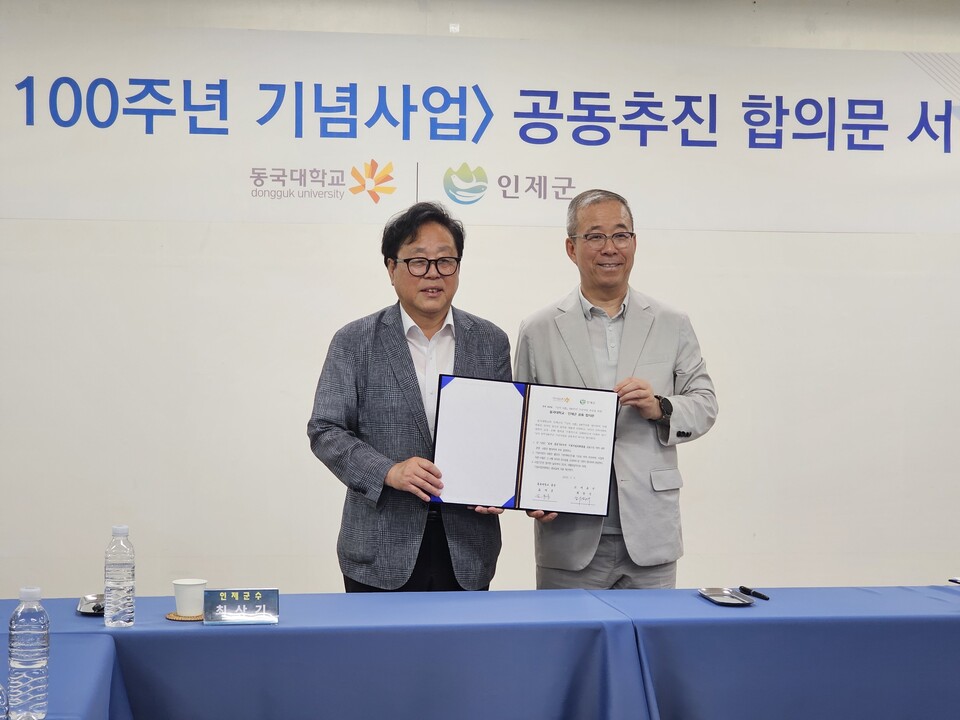 µ¿±¹´ëÇб³¿Í °­¿øµµ ÀÎÁ¦±ºÀÌ ¸¸ÇØ ÇÑ¿ë¿î ¼±»çÀÇ ½ÃÁý ¹ß°£ 100ÁÖ³âÀ» ¸Â¾Æ ±â³ä»ç¾÷À» °øµ¿À¸·Î ÃßÁøÇÑ´Ù°í µ¿±¹´ë ¸¸ÇØ¿¬±¸¼Ò°¡ 7¿ù14ÀÏ ¹àÇû´Ù.  ¾çÃøÀº 7¿ù 11ÀÏ ÀÎÁ¦±º µ¿±¹´ë ¸¸Çظ¶À»¿¡¼­ ±â³ä»ç¾÷ÀÇ ¼º°øÀûÀÎ ÃßÁøÀ» À§ÇÑ °øµ¿ ÇÕÀǹ®¿¡ ¼­¸íÇÏ¸ç º»°ÝÀûÀÎ Çù·ÂÀÇ ½ÃÀÛÀ» ¾Ë·È´Ù. (¿ÞÂʺÎÅÍ) ÃÖ»ó±â ÀÎÁ¦±º¼ö, À±Àç¿õ µ¿±¹´ë ÃÑÀå.