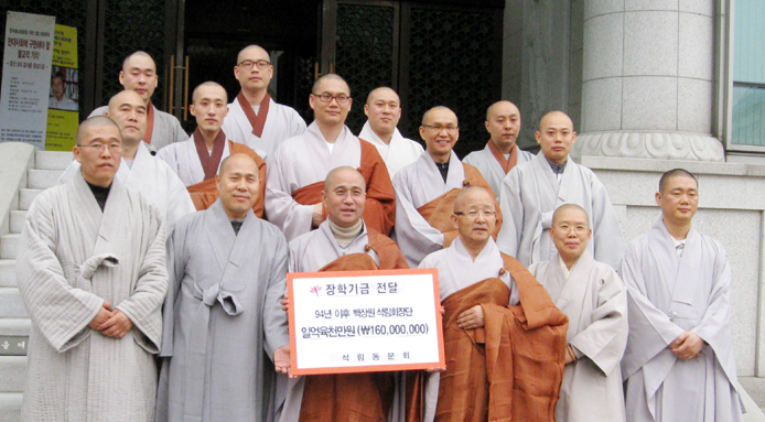 µ¿±¹´ë Á¾ºñ»ý Á¹¾÷»ý ¸ðÀÓÀÎ ¼®¸²µ¿¹®È¸(ȸÀå ¿µ´ã½º´Ô, Á¶°èÁ¾ Ãѹ«ºÎÀå)µµ ÀçÇÐ ÁßÀÎ ÇÐÀνº´ÔµéÀ» À§ÇÑ ÀåÇÐÀç´Ü ¼³¸³¿¡ ³ª¼¹´Ù. ¼®¸²µ¿¹®È¸ ½º´ÔµéÀº 24ÀÏ Çѱ¹ºÒ±³¿ª»ç¹®È±â³ä°ü 2Ãþ ȸÀǽǿ¡¼ ¼®¸²µ¿¹®È¸Àå ¿µ´ã½º´Ô¿¡°Ô ¼®¸²È¸ ÀåÇÐÀç´Ü ¼³¸³¿¡ ½á´Þ¶ó¸ç 1¾ï6000¸¸¿øÀÇ ±â±ÝÀ» Àü´ÞÇß´Ù. ÀÌ ÀÚ¸®¿¡¼ µ¿¹®È¸Àå ¿µ´ã½º´ÔÀº 5000¸¸¿ø Áö¿øÀ» ¾à¼ÓÇØ ´«±æÀ» ²ø¾ú´Ù.