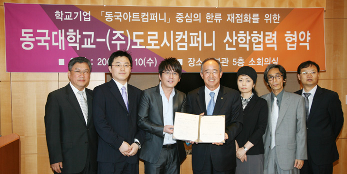 µ¿±¹´ëÇб³¿Í °¡¼ö ½Å½ÂÈÆ ¾¾°¡ Çѱ¹ ´ëÁß¹®È¿Í ¿¹¼ú »ê¾÷ ¼±µµ¸¦ À§ÇØ ¼ÕÀ» ¸ÂÀâ¾Ò´Ù. µ¿±¹´ë(ÃÑÀå ¿À¿µ±³)¿Í °¡¼ö ½Å½ÂÈÆ ¾¾(»çÁø ¿ÞÂÊ¿¡¼ ¼¼¹øÂ°)°¡ ¼³¸³ÇÑ µµ·Î½ÃÄÄÆÛ´Ï´Â Áö³ 10ÀÏ 60¾ï¿ø ±Ô¸ðÀÇ »êÇÐÇù·Â ¾çÇØ°¢¼(MOU)¸¦ ü°áÇß´Ù. <»çÁø>